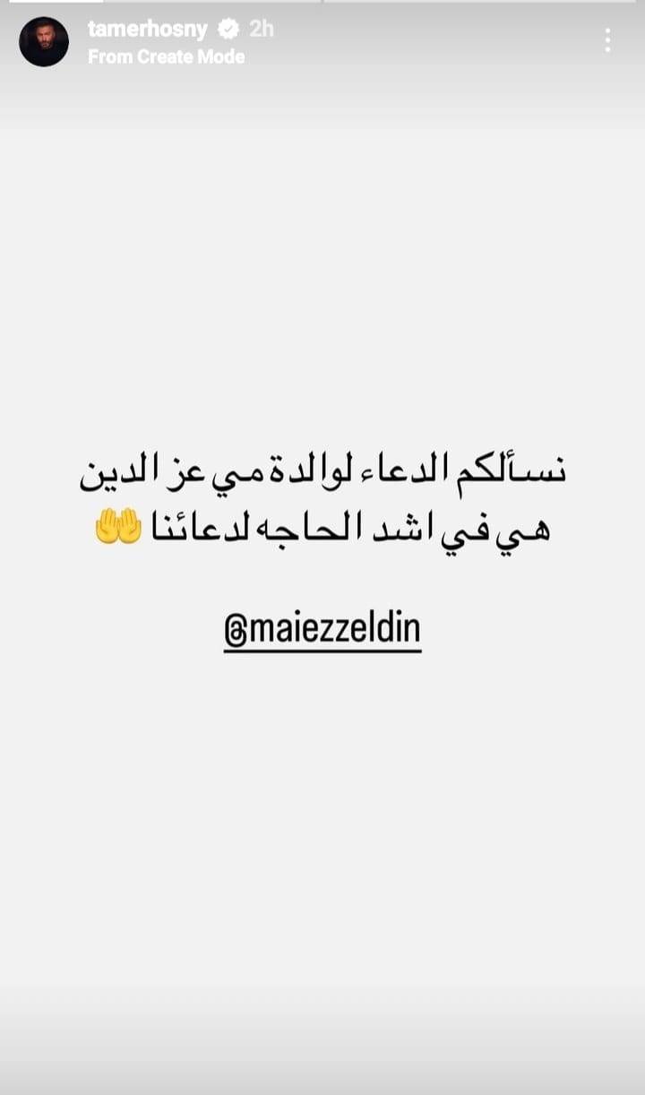 علق تامر حسني قائلا : "نسألكم الدعاء لوالدة مي عز الدين، هي في أشد الحاجة لدعائنا" .