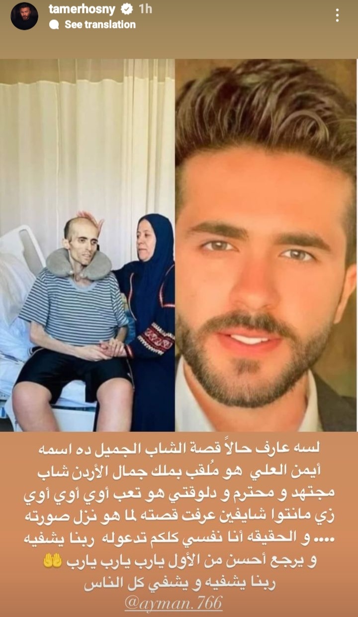 ونشر تامر حسني ستوري عبر حسابه الرسمي على موقع "إنستجرام" وكتب"لسة عارف حالا قصة الشاب الجميل ده اسمه ايمن العلي هو ملقب بملك جمال الأردن شاب مجتهد ومحترم ودلوقتي هو تعب أو أوى زيما انتوا شايفين عرفت قصته، لما هو نزل صورته والحقيقة أنا نفسي كلكم تدعوله ربنا يشفيه ويرجع أحسن من الأول،ربنا يشفية ويشفي كل الناس.
