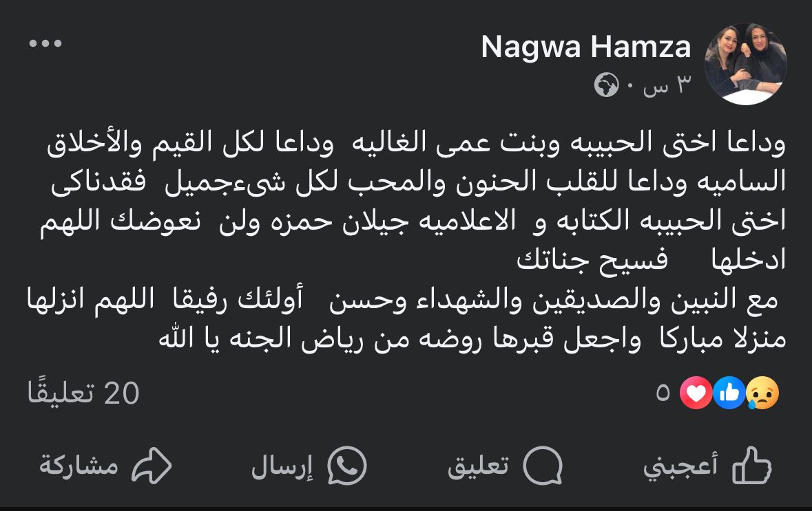 كتبت ابنة عم الإعلامية جيلان حمزة منشور على صفحتها الرسمية عبر موقع التواصل الاجتماعي "فيسبوك" معلنة فيه وفاة الفنانة الراحلة، وعلقت ابنة عمها قائلة : وداعا أختي الحبيبة وبنت عمى الغالية، وداعًا لكل القيم والأخلاق السامية، وداعًا للقلب الحنون والمحب لكل شئ جميل".