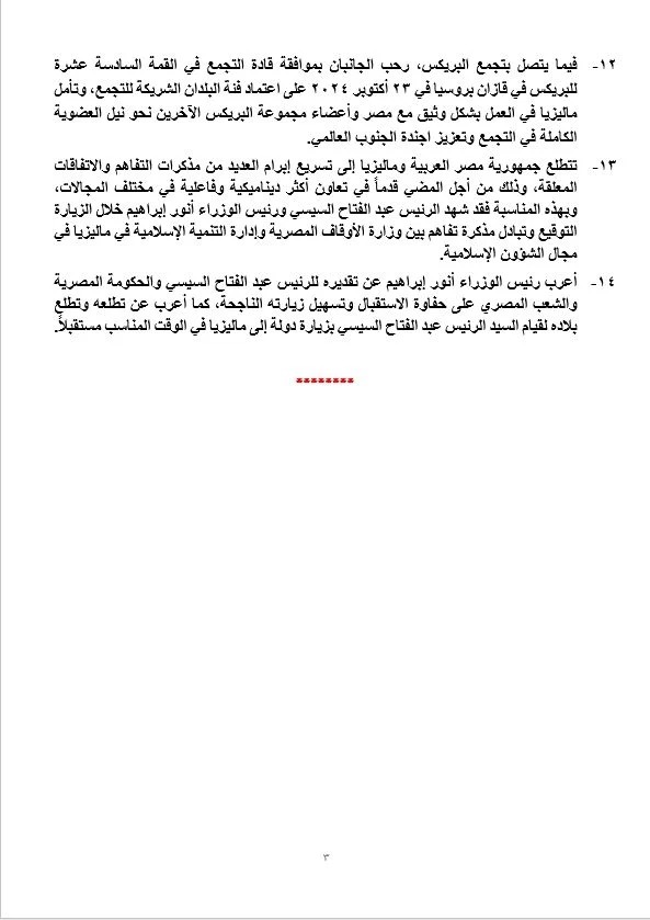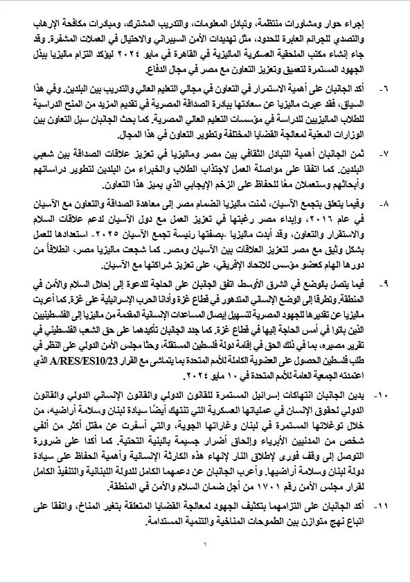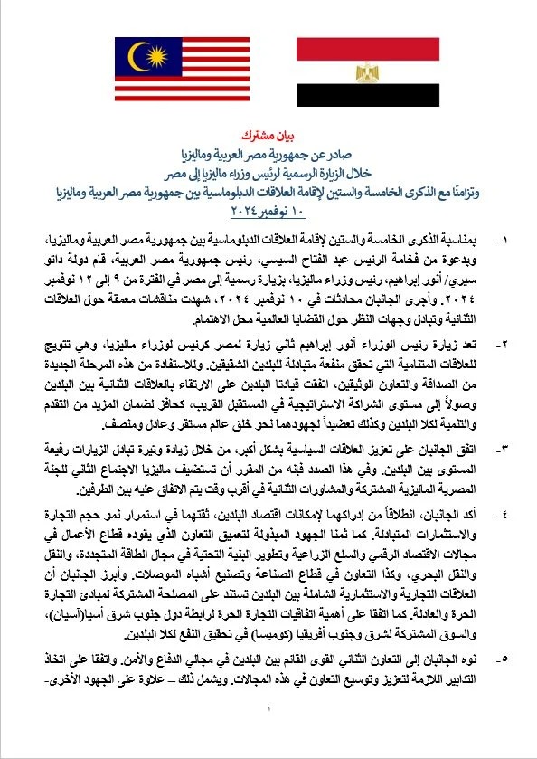 وأكد البيان أنه بدعوة من الرئيس عبد الفتاح السيسي، رئيس جمهورية مصر العربية، قام داتو سيري/ أنور إبراهيم، رئيس وزراء ماليزيا، بزيارة رسمية إلى مصر في الفترة من 9 إلى 12 نوفمبر 2024. وأجرى الجانبان محادثات في 10 نوفمبر 2024، شهدت مناقشات معمقة حول العلاقات الثنائية وتبادل وجهات النظر حول القضايا العالمية محل الاهتمام.