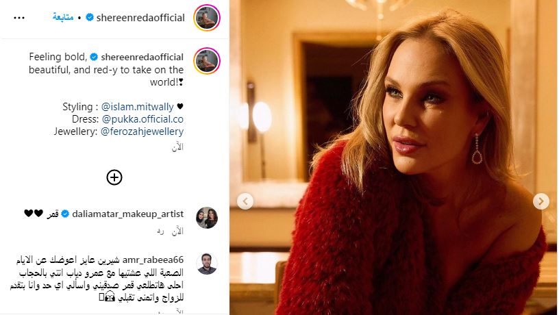 وظهرت شيرين بإطلالة جذابة وملفتة بفستان أحمر وعلقت على الصور" الشعور بالجرأة والجمال بالاحمر للتغلب على العالم ".