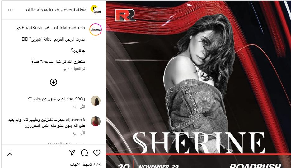 وفي نفس السياق نشرت الصفحة الرسمية لـ رود راش الكويت البوستر الدعائي لحفل شيرين وعلقت " غير RoadRush مع ،صوت الوطن العربي الفنانة "شيرين" ،جاهزين؟