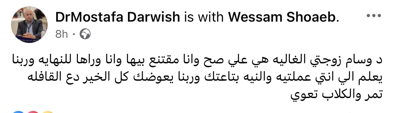 وعلق الدكتور مصطفى درويش، زوج الطبيبة وسام شعيب، عن موقف زوجته عبر حسابه الشخصي على "فيسبوك"، بعد القبض عليها في البحيرة، قائلا: "دكتورة وسام زوجتي هي على صح وأنا مقتنع بيها ووراها للنهاية، وربنا يعلم النية، وأنها لم تفشي أسرار مرضاها سواء بذكر أسماء أو صفات يمكن أن يستدل عليهن بها".