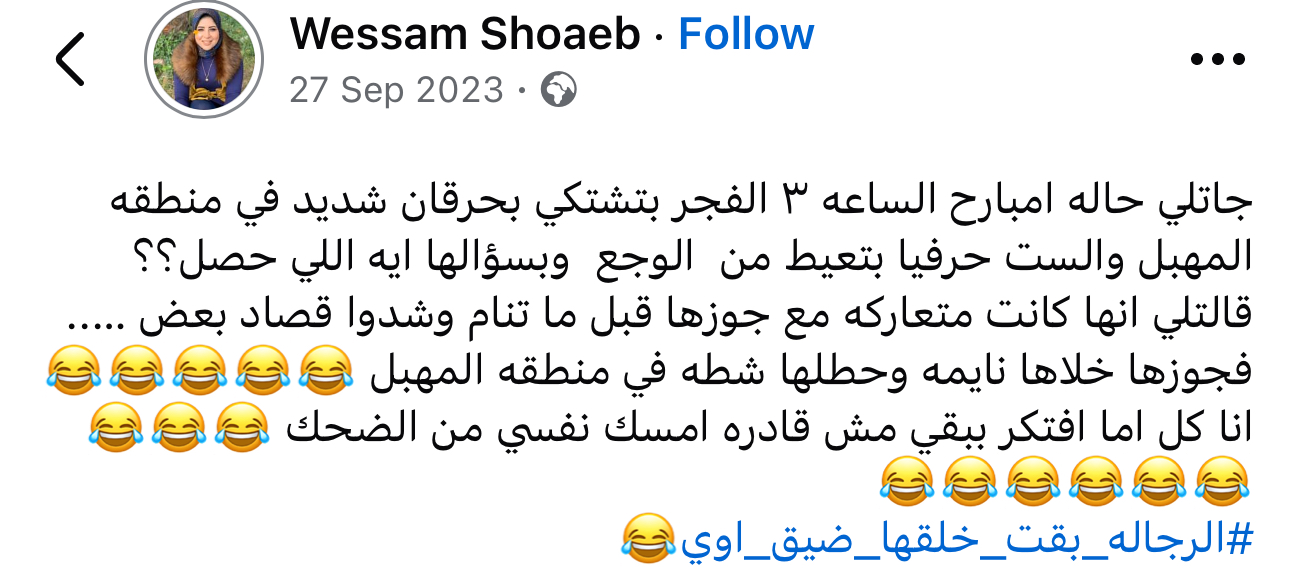 قالتلي انها كانت متعاركه مع جوزها قبل ما تنام وشدوا قصاد بعض ….. فجوزها خلاها نايمه وحطلها شطه في منطقه المهبل انا كل اما افتكر ببقي مش قادره امسك نفسي من الضحك.. الرجاله بقت خلقها ضيق اوي".