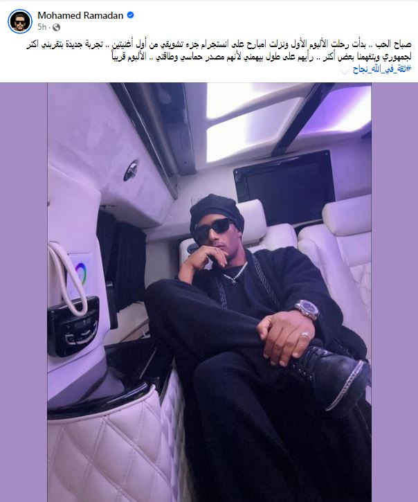 وشارك محمد رمضان متابعيه عبر صفحته الرسمية "فيس بوك"صورة جديدة له وعلق عليها" صباح الحب ،بدأت رحلت الألبوم الأول ونزلت امبارح على انستجرام جزء تشويقي من أول أغنيتين ، تجربة جديدة بتقربني اكتر لجمهوري وبتفهمنا بعض أكتر ، رأيهم على طول بيهمني لأنهم مصدر حماسي وطاقتي ،الألبوم قريباً.
