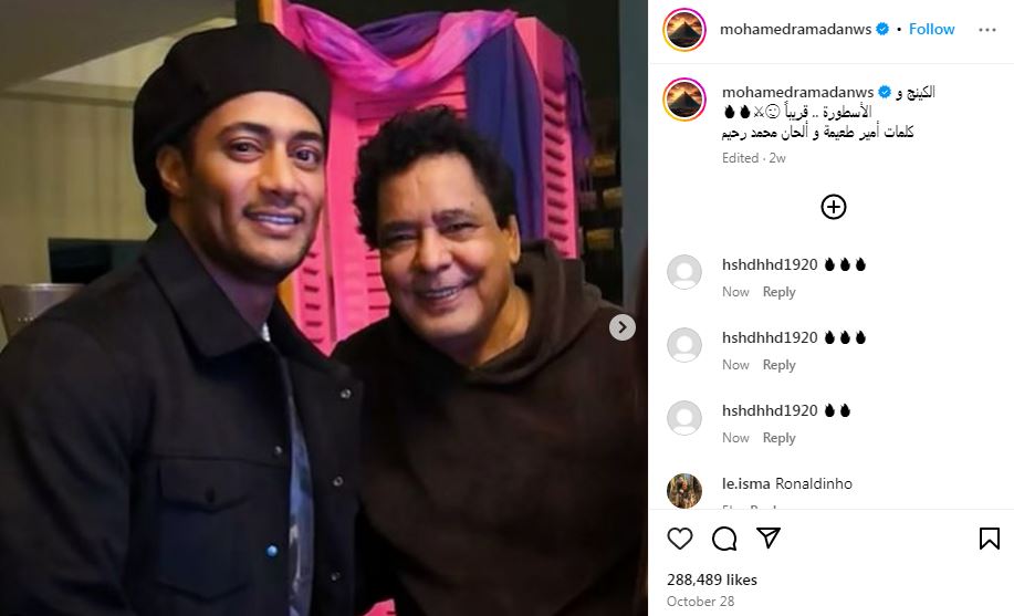نشر محمد رمضان صورة تجمعه مع منير على صفحته الرسمية عبر موقع تبادل الصور والفيديوهات "إنستجرام" وعلق قائلا : "الكينج والأسطورة.. قريبا، كلمات أمير طعيمة وألحان محمد رحيم" .
