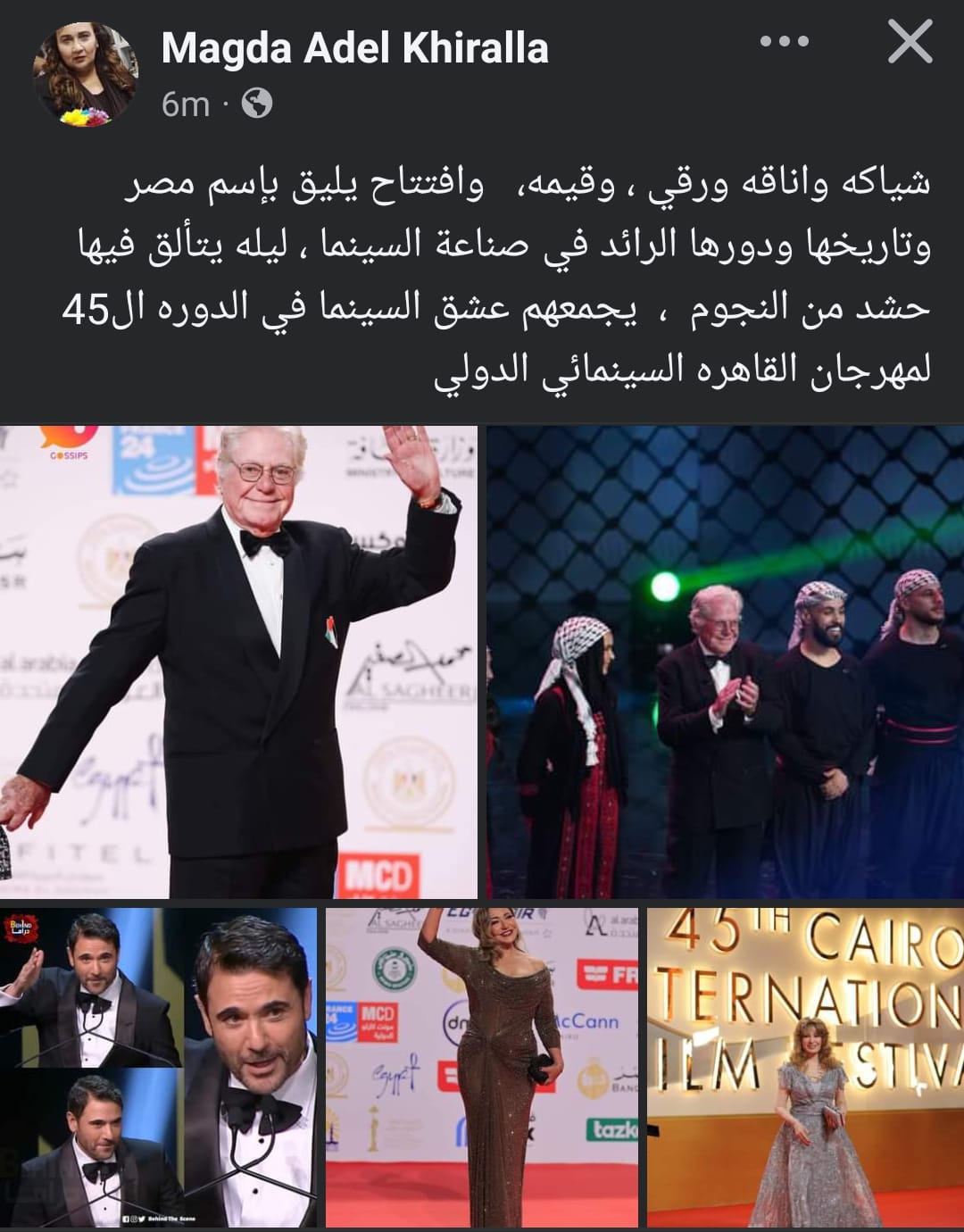 كتبت ماجدة خير الله منشور على صفحتها الرسمية عبر موقع التواصل الاجتماعي "فيسبوك" وعلقت قائلة : "شياكة وأناقة ورقي وقيمة، وافتتاح يليق باسم مصر وتاريخها ودورها الرائد في صناعة السينما، ليلة يتألق فيها حشد من النجوم يجمعهم عشق السينما في الدورة الـ 45 لمهرجان القاهرة السينمائي الدولي" .