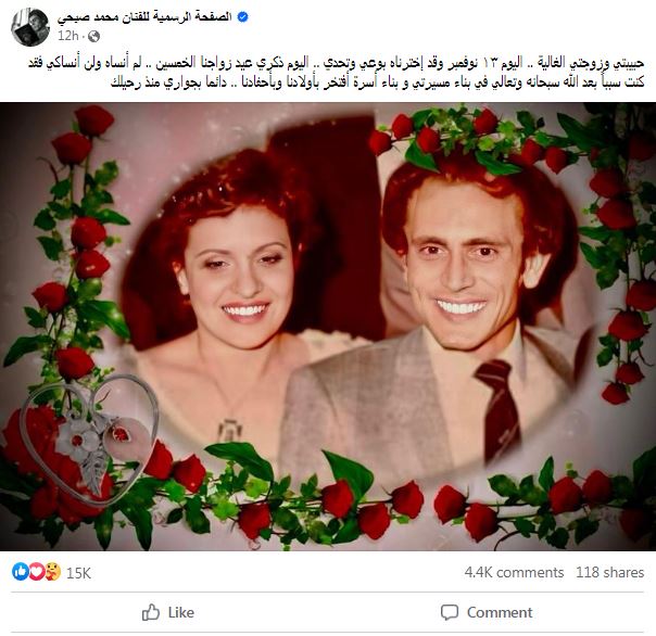 ونشر صبحي صورة تجمعه بزوجته وعلق عليها " حبيبتي وزوجتي الغالية .. اليوم ١٣ نوفمبر وقد إخترناه بوعي وتحدي،اليوم ذكري عيد زواجنا الخمسين ، لم أنساه ولن أنساكي فقد كنت سبباً بعد الله سبحانه وتعالى في بناء مسيرتي و بناء أسرة أفتخر بأولادنا وأحفادنا .. دائما بجواري منذ رحيلك.