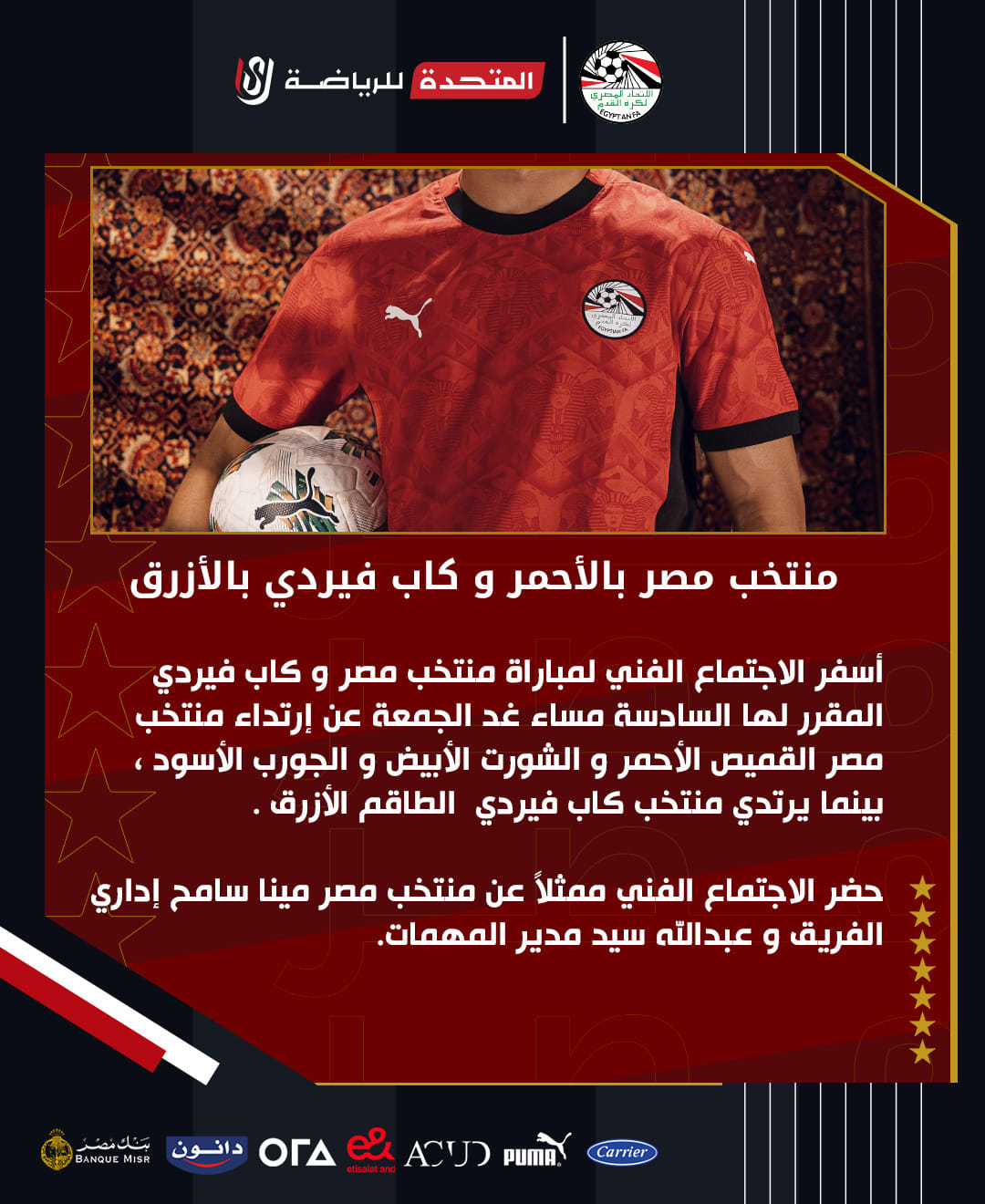 وحضر الاجتماع الفني لمباراة منتخب مصر وكاب فيردي ممثلاً عن منتخب مصر مينا سامح إداري الفريق وعبدالله سيد مدير المهمات.