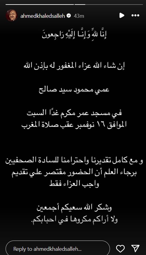 وفي هذا السياق، كشف الفنان أحمد خالد صالح، عبر حسابه الرسمي بموقع تداول الصور والفيديوهات " إنستجرام" عن موعد ومكان عزاء عمه، قائلا: " إنا لله وإنا إليه راجعون، إن شاء الله عزاء المغفور له عمى محمود سيد صالح، في مسجد عمر مكرم، غدا السبت الموافق لـ 16 نوفمبر عقب صلاة المغرب، وكامل تقديرنا واحترامنا للصحفيين، أن الحضور مقتصر على تقديم واجب العزاء فقط، وشكر الله سعيكم أجمعين".