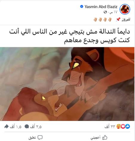 شاركت الفنانة ياسمين عبد العزيز صورة عبر صفحتها الرسمية "فيس بوك" وكانت الصورة معلقة علية "دايمًا الندالة مش بتيجي غير من الناس اللي أنت كويس وجدع معاهم".