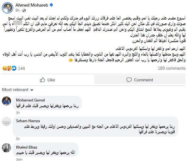 نشر الفنان أحمد محارب عبر صفحته الرسمية "فيس بوك"كلمات مؤثرة تذكر فيها والدته التي رحلت عن عالمنا الأسبوع الماضي .