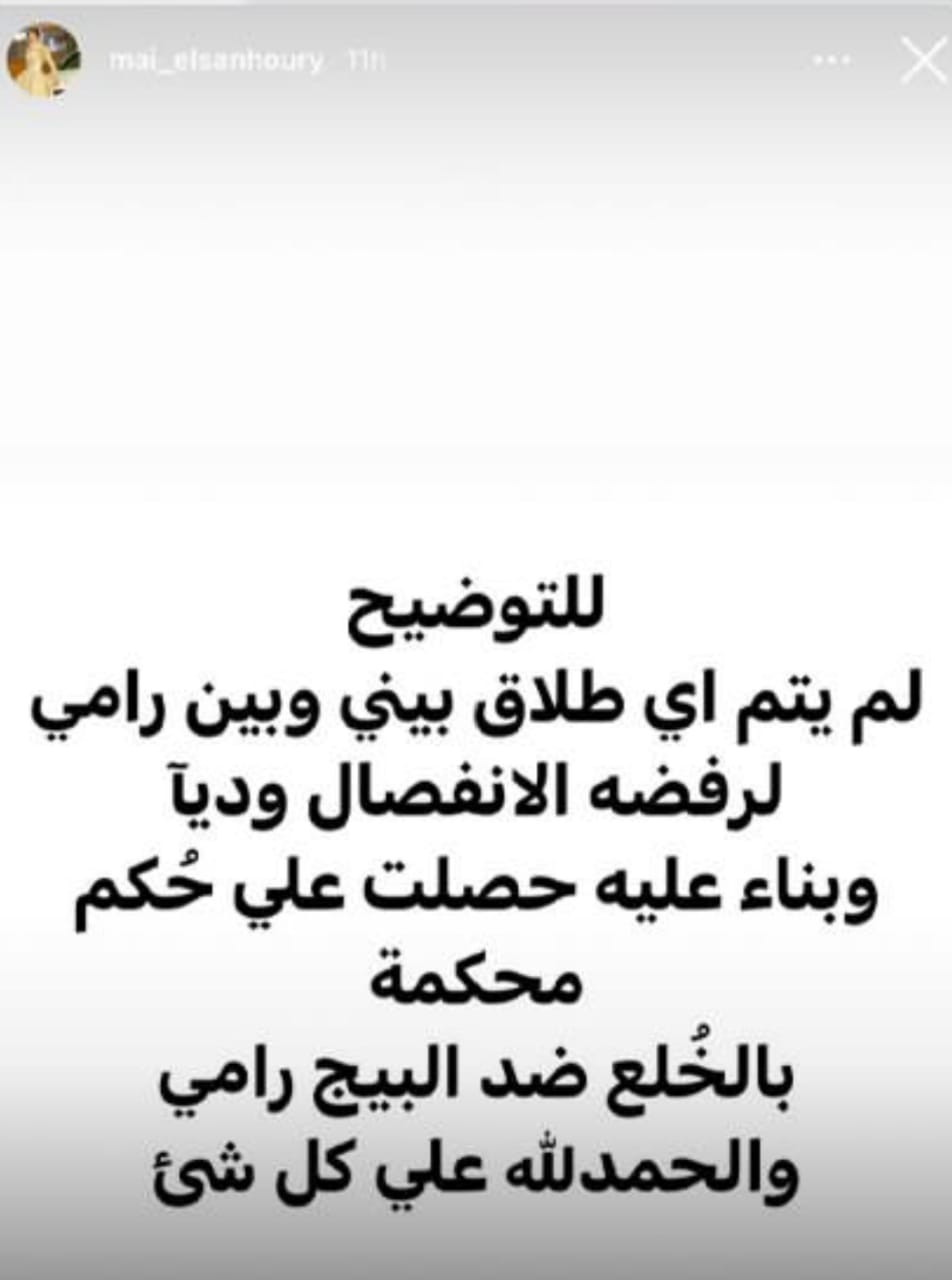 وكتبت عبر ستوري في حسابها الشخصي بموقع تبادل الصور والفيديوهات “إنستجرام”: لم يتم اي طلاق بيني وبين رامي لرفضه الانفصال وديا وبناء عليه حصلت علي حكم محكمة بالخلع ضد البيج رامي والحمد لله على كل شئ".