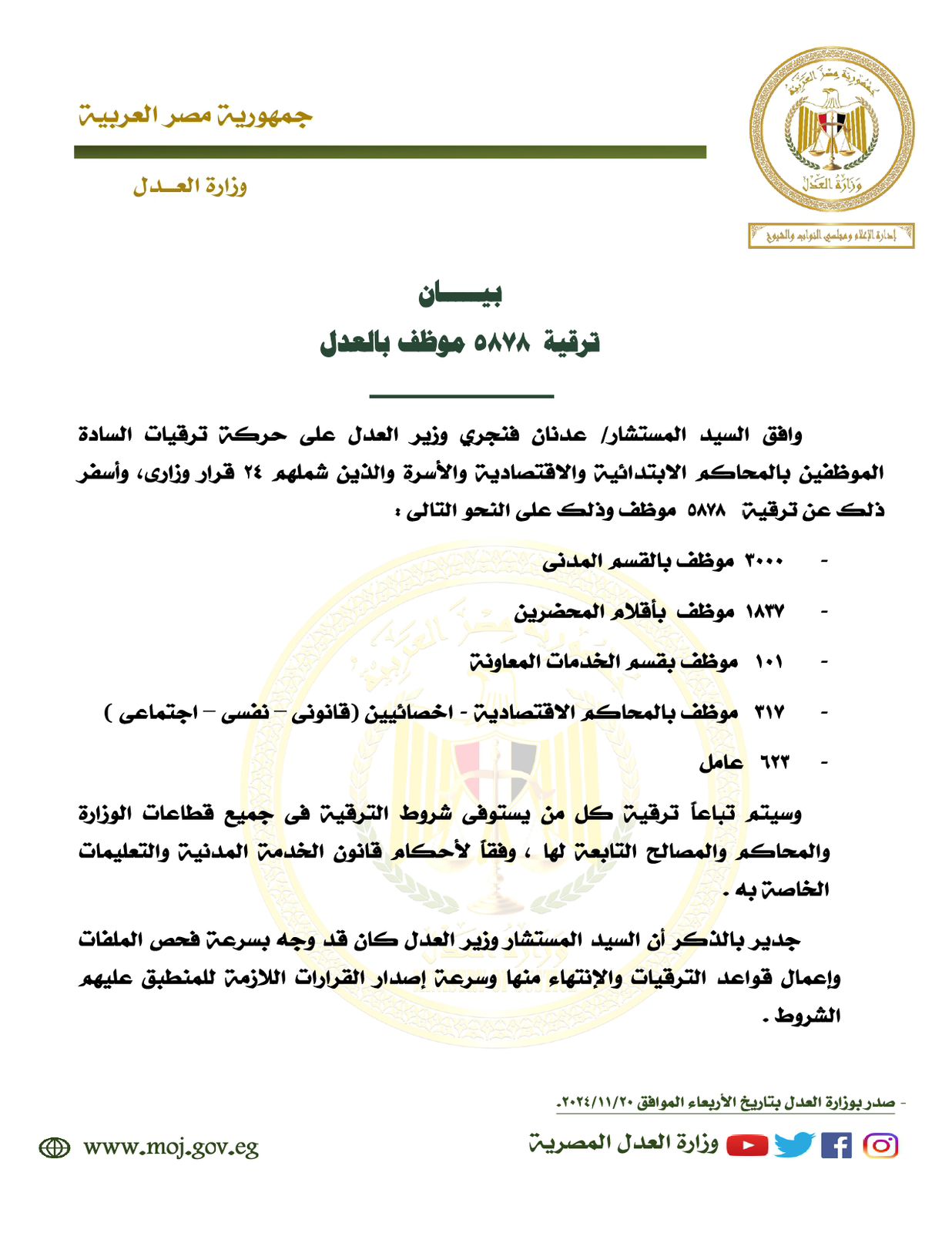 وسيتم تباعاً ترقية كل من يستوفى شروط الترقية فى جميع قطاعات الوزارة والمحاكم والمصالح التابعة لها، وفقاً لأحكام قانون الخدمة المدنية والتعليمات الخاصة به.