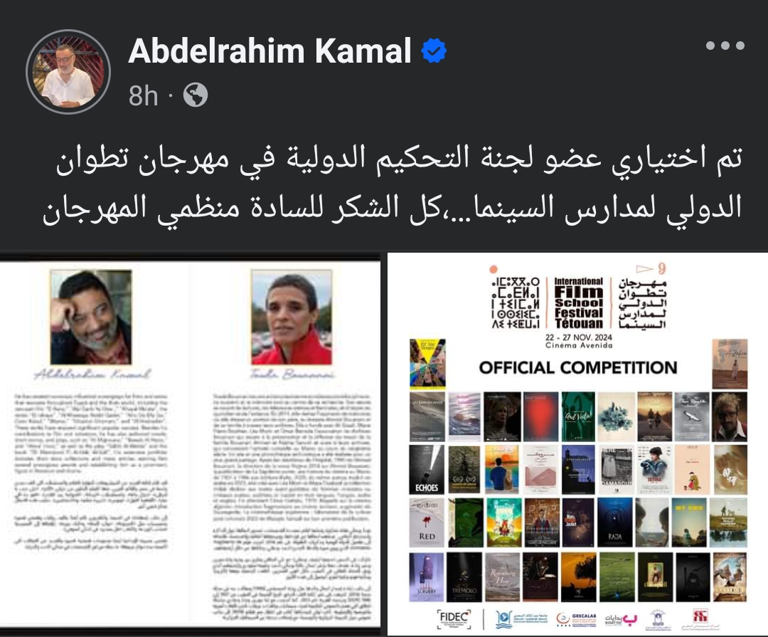 وكتب عبد الرحيم كمال منشورا على صفحته الرسمية عبر موقع التواصل الاجتماعي "فيسبوك" وعلق قائلا : تم اختياري عضو لجنة التحكيم الدولية في مهرجان تطوان الدولي لمدارس السينما، كل الشكر للسادة منظمي المهرجان .