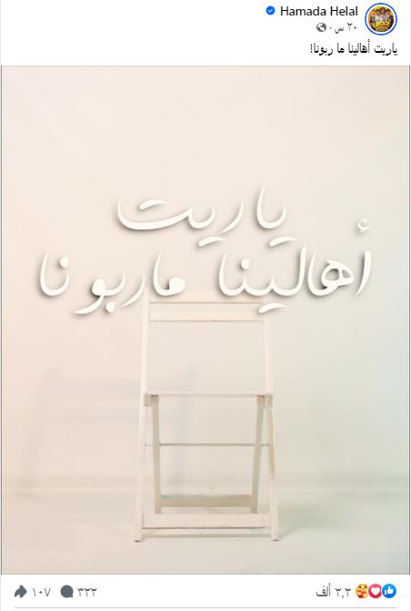 أثار النجم حمادة هلال حيرة متابعيه وجمهوره وذلك بعد نشر صورة معلقة عليها «ياريت أهالينا ما ربونا» مما أثار الجدل والحيرة.