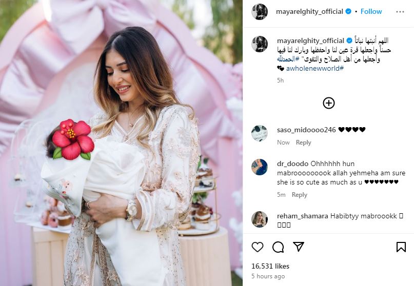 و نشرت ميار ، صورة لها برفقة مولودتها وعلقت عليها عبر "انستجرام":"اللهم أنبتها نباتًا حسنًا واجعلها قرة عين لنا واحفظها وبارك لنا فيها واجعلها من أهل الصلاح والتقوى".