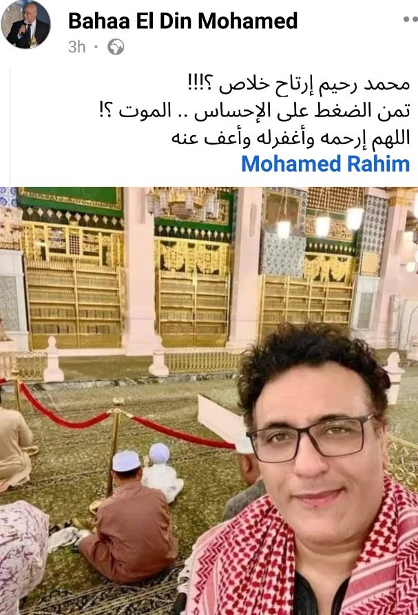 ونعى الشاعر بهاء الدين محمد الملحن محمد رحيم ،ونشر على صفحته الشخصية على موقع التواصل الاجتماعى "فيس بوك" منشور بكلمات غامضة موضحًا أنه تعرض لحالة من الضغط .