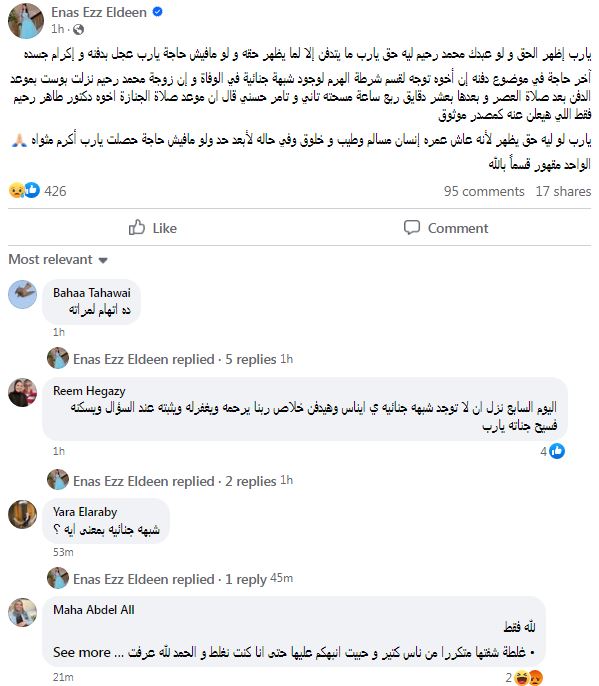 وأضافت "آخر حاجة في موضوع دفنه إن أخوه توجه لقسم شرطة الهرم لوجود شبهة جنائية في الوفاة و إن زوجة محمد رحيم نزلت بوست بموعد الدفن بعد صلاة العصر وبعدها بعشر دقايق ربع ساعة مسحته تاني و تامر حسني قال ان موعد صلاة الجنازة اخوه دكتور طاهر رحيم فقط اللي يعلن عنه كمصدر موثوق ".