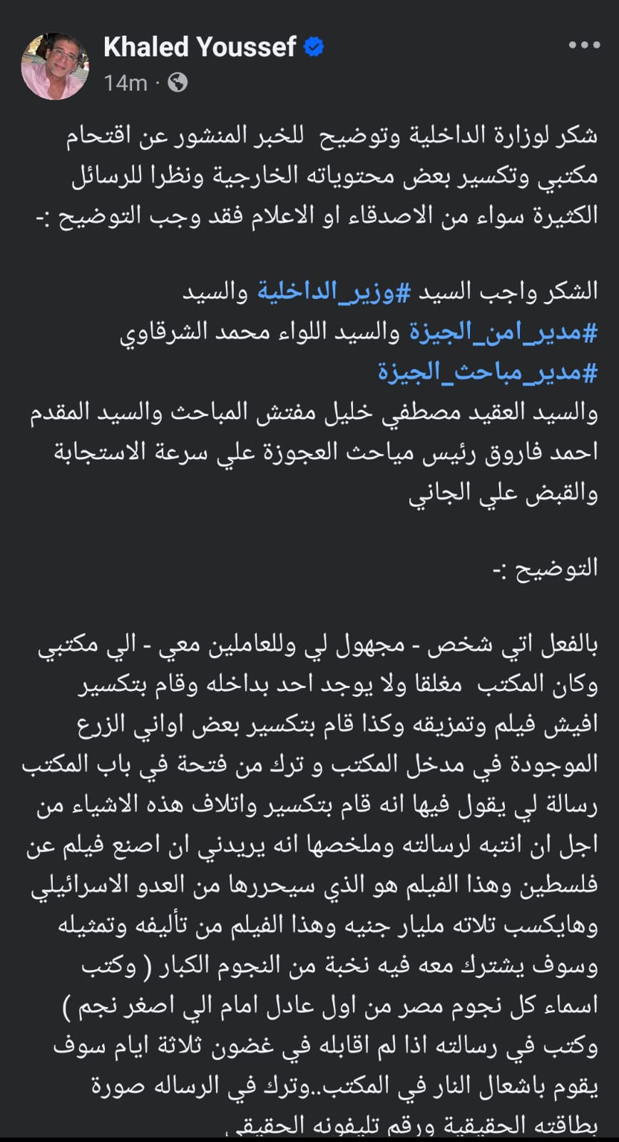 كتب خالد يوسف منشورا على صفحته الرسمية عبر موقع التواصل الاجتماعي "فيسبوك" وعلق قائلا : شكر لوزارة الداخلية وتوضيح للخبر المنشور عن اقتحام مكتبي وتكسير بعض محتوياته الخارجية ونظرا للرسائل الكثيرة سواء من الاصدقاء او الاعلام فقد وجب التوضيح: “الشكر واجب وزير الداخلية والسيد مدير امن الجيزة واللواء محمد الشرقاوي مدير مباحث الجيزة والسيد العقيد مصطفي خليل مفتش المباحث والسيد المقدم احمد فاروق رئيس مياحث العجوزة علي سرعة الاستجابة والقبض علي الجاني”.