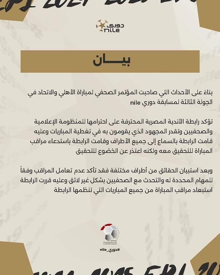 قالت رابطة الأندية في بيان رسمي لها: “بناءً على الأحداث التي صاحبت المؤتمر الصحفي لمباراة الأهلي والاتحاد في الجولة الثالثة لمسابقة دوري nile”
