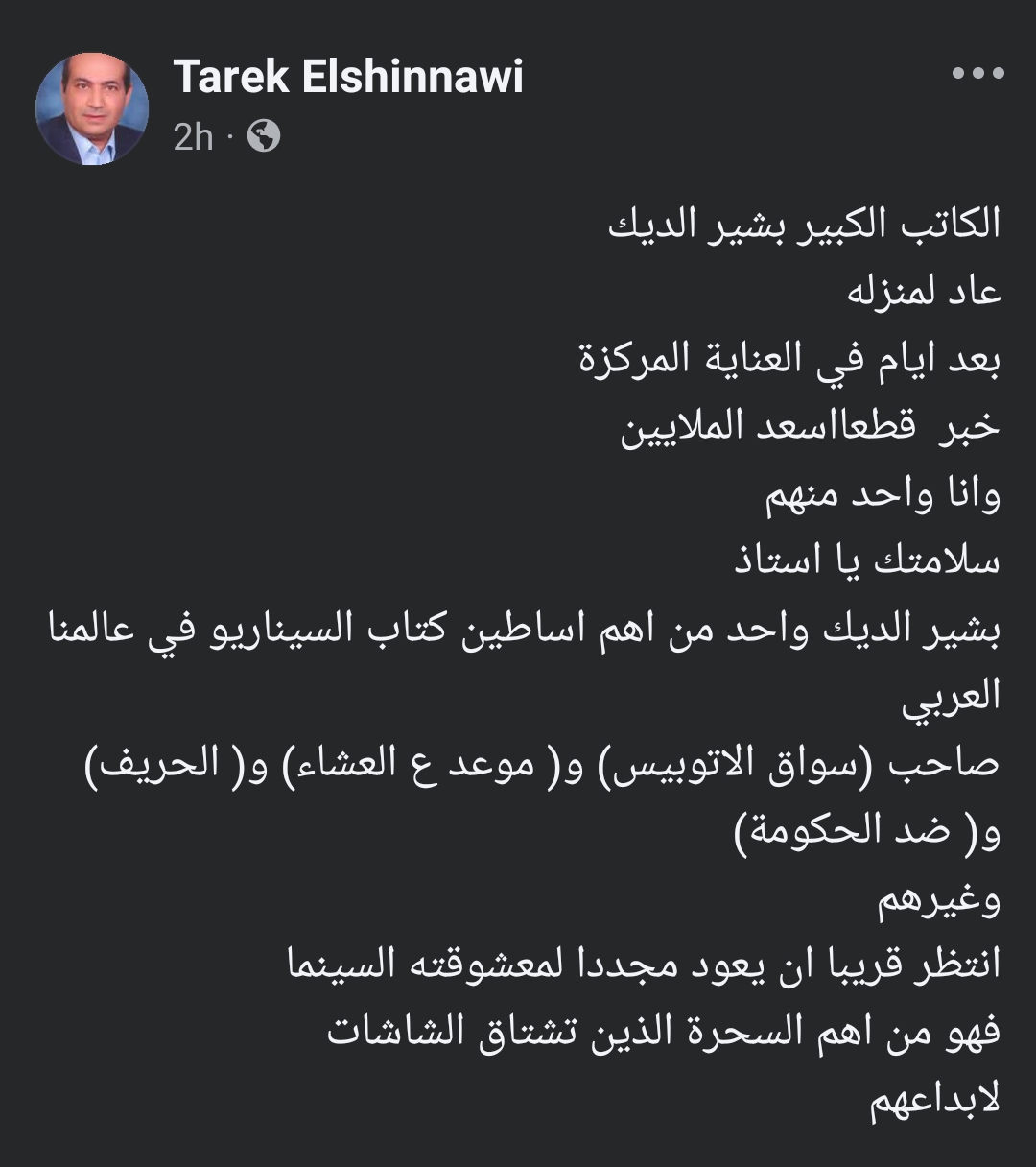 كتب طارق الشناوي منشورا على صفحته الرسمية عبر موقع التواصل الاجتماعي "فيسبوك" وعلق قائلا : "الكاتب الكبير بشير الديك عاد لمنزله بعد أيام في العناية المركزة، خبر قطعا أسعد الملايين وأنا واحد منهم، سلامتك يا أستاذ" .