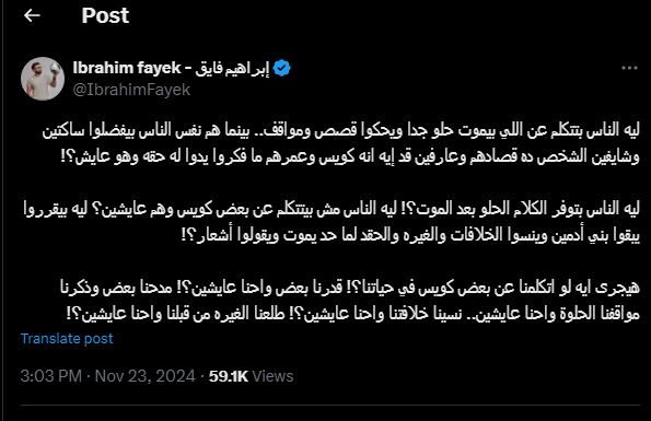 وكتب فايق عبر صفحته الرسمية منصة "أكس " تويتر سابقآ " ليه الناس بتتكلم عن اللي بيموت حلو جدا و يحكوا قصص ومواقف.. بينما هم نفس الناس يفضلوا ساكتين وشايفين الشخص ده قصادهم وعارفين قد إيه انه كويس وعمرهم ما فكروا يدوا له حقه وهو عايش؟!