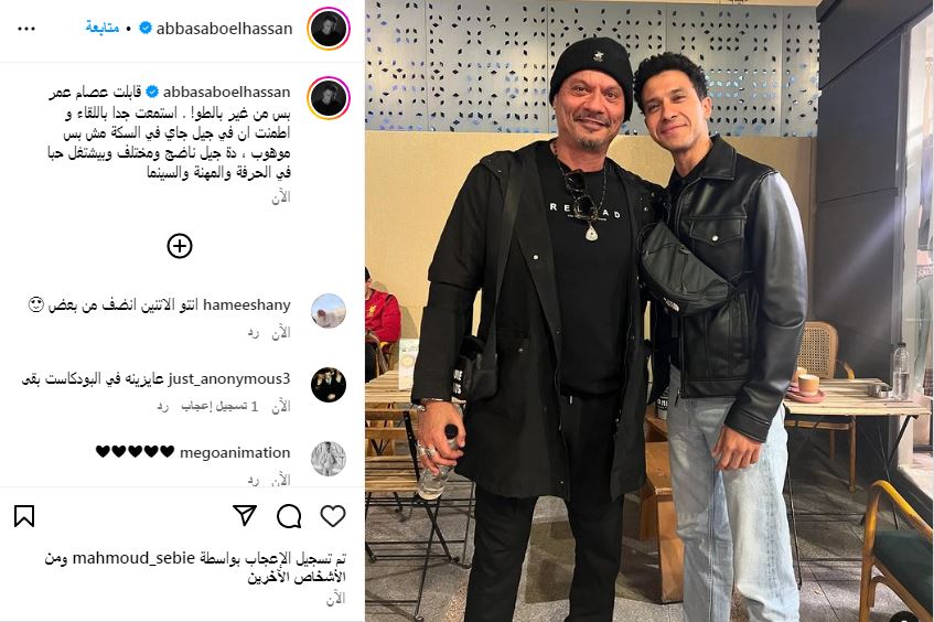 ونشر عباس صورة تجمعه بعصام عمر وعلق عليها " قابلت عصام عمر بس من غير بالطو! . استمعت جدا باللقاء و اطمنت ان في جيل جاي في السكة مش بس موهوب ، دة جيل ناضج ومختلف بيشتغل حبا في الحرفة والمهنة والسينما".