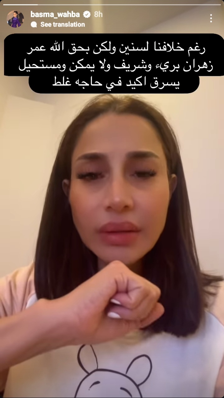 ونشرت بسمة فيديو عبر خاصية "الأستوري " عبر صفحتها الرسمية "إنستجرام" وعلقت" رغم القطيعة اللي بيني وبين المخرج عمر زهران الممتدة لسنين، لكن أشهد الله، إن المخرج عمر زهران أياديه بيضاء، وانا عاشرته ودخل بيتنا ودخلت بيتهم ولا يمكن يسرق، ورجل شريف ميختلفش عليه اتنين واكيد في حاجة غلط ،أدعو المسؤولين لتحري الدقة".