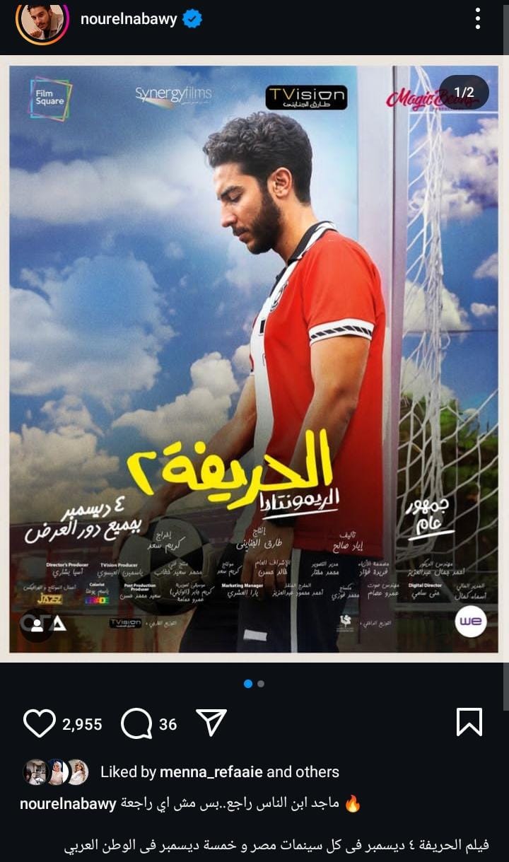 كشف الفنان نور النبوي عن موعد عرض فيلم الحريفة 2 في السينمات وذلك من خلال حسابة الرسمي علي موقع تبادل الصور والفديوهات القصيرة إنستجرام، والذي من المقرر عرضة خلال الفترة المقبلة.