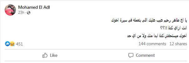 كما علق المخرج ماندو العدل عبر صفحته وكتب" يا اخ طاهر رحيم عيب عليك اللي بتعمله في سيرة اخوك ،انت ازاي كده !!؟؟،اخوك ميستحقش كدة ابدا منك ولا من اي حد".