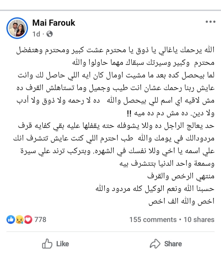 وأضافت " حد يعالج الراجل ده وللا يشوفله حته يقفلها عليه بقي كفايه قرف مردودالك في يومك والله طب احترم اللي كنت عايش تتشرف انك علي اسمه يا اخي وللا نفسك في الشهرة. وبتركب ترند علي سيرة وسمعة واحد الدنيا تتشرف بيه منتهى الرخص والقرف، حسبنا الله ونعم الوكيل كله مردود والله، اخص والله الف اخص".