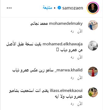 وظهر سامو في إطلالته بتسريحة شعر أشقر كما أطلق الجزء الأسفل من لحيته وارتدى نظّارات بدا فيها وكأنه عمر دياب، وهو ما دفع العديد من متابعيه من طرح الأسئلة بطريقة طريفة وجاءت من بين التعليقات: " يعني انت استحميت بشامبو عمرو دياب ولا ايه ، سامو زين مكس عمرو دياب ، بقيت نسخة طبق الأصل من عمرو دياب".