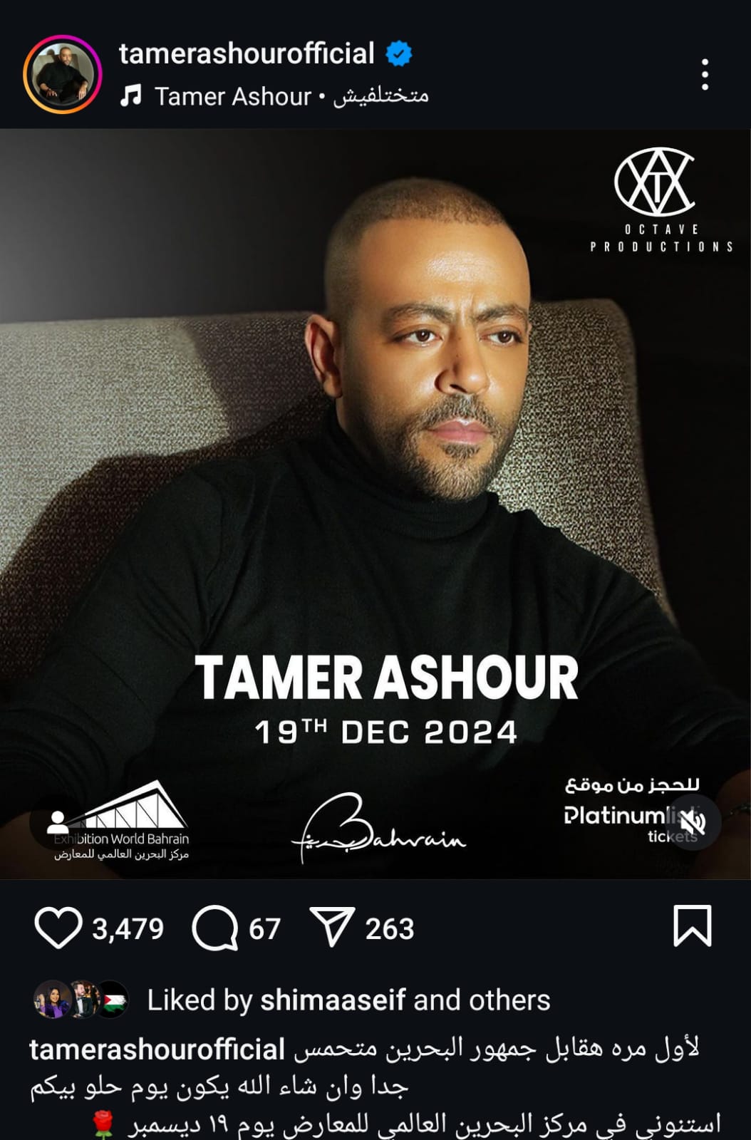 نشر تامر عاشور صورة بوستر الحفل على صفحته الرسمية عبر موقع تبادل الصور والفيديوهات "إنستجرام" وعلق قائلا : "لأول مرة هقابل جمهور البحرين، متحمس جدا وإن شاء الله يكون يوم حلو بيكم، استنوني في مركز البحرين العالمي للمعارض يوم 19 ديسمبر" .