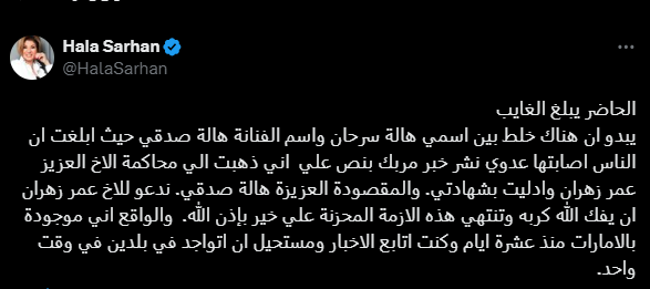 وقالت: الحاضر يبلغ الغايب.. يبدو أن هناك خلطًا بين اسمي هالة سرحان واسم الفنانة هالة صدقي، حيث أبلغت أن الناس أصابتها عدوى نشر خبر مربك، ينص على أني ذهبت إلى محاكمة الأخ العزيز عمر زهران وأدليت بشهادتي".