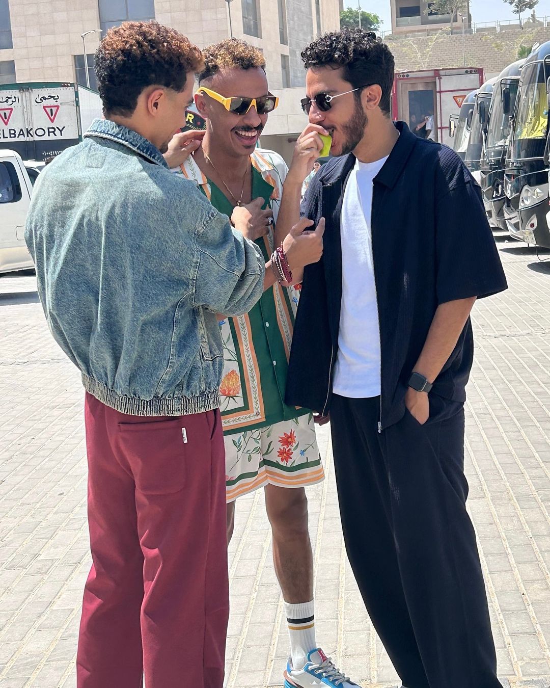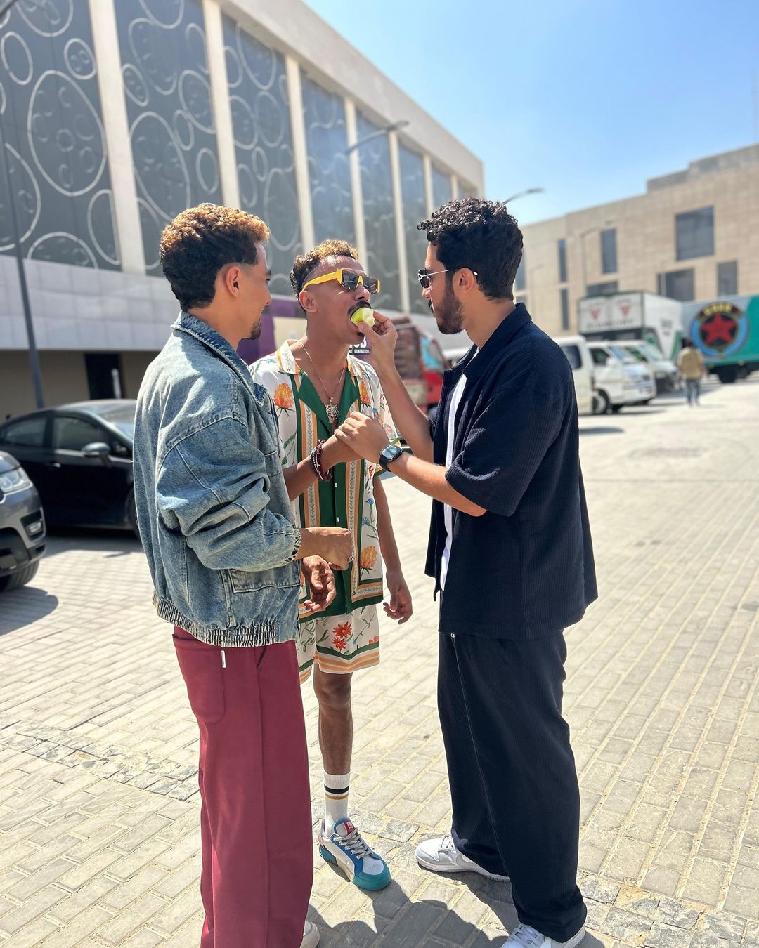 وظهر نور بحركات عفوية مع أبطال العمل وعلق عليها كاشفا عن أسماء شخصيات أبطال العمل " ماجد و حتة و شيشتاوي ، بيمسوا".