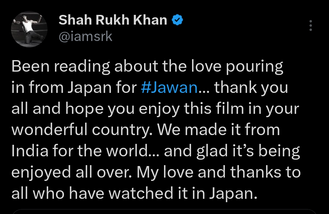 كتب شاروخان تغريدة على صفحته الرسمية عبر منصة "إكس" وعلق قائلا : "كنت أقرأ عن الحب المتدفق من اليابان لـ Jawan، شكرًا لكم جميعًا وأتمنى أن تستمتعوا بهذا الفيلم في بلدكم الرائع، لقد صنعناه من الهند للعالم، ويسعدنا الاستمتاع به في كل مكان، حبي وشكرا لجميع الذين شاهدوه في اليابان".