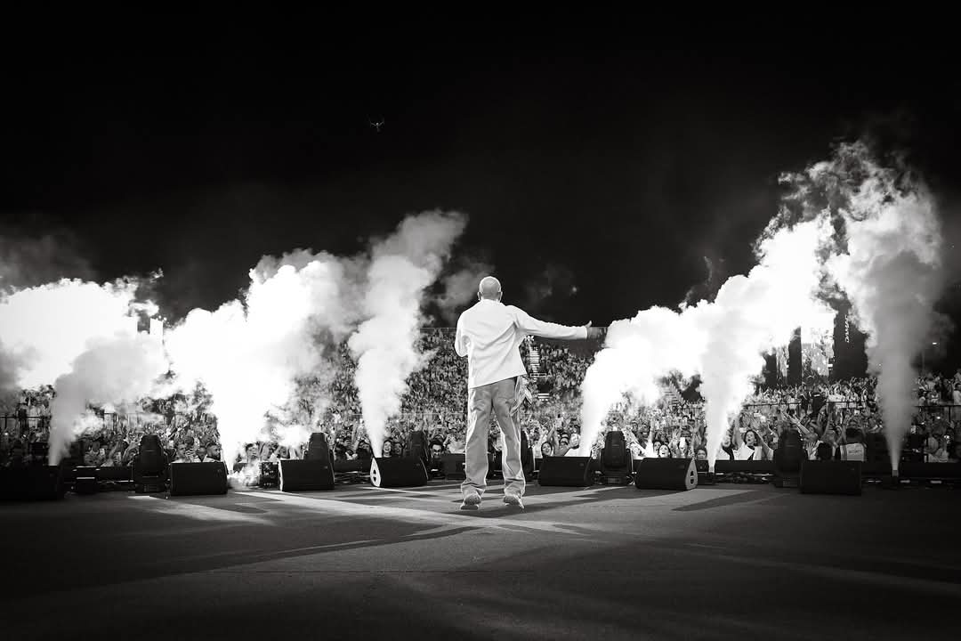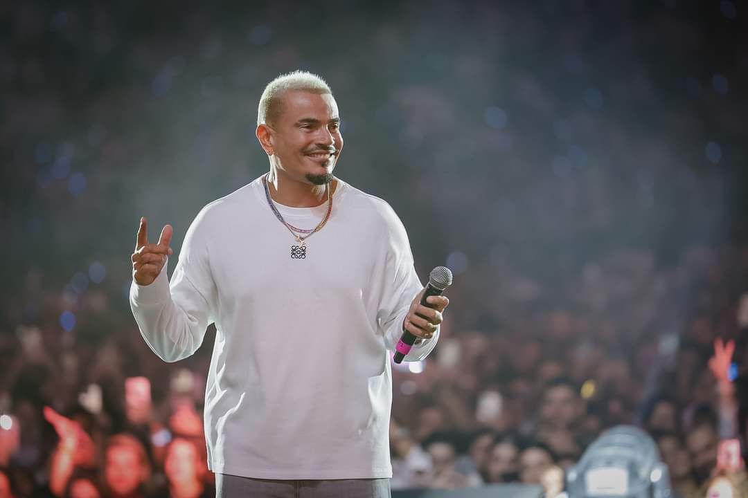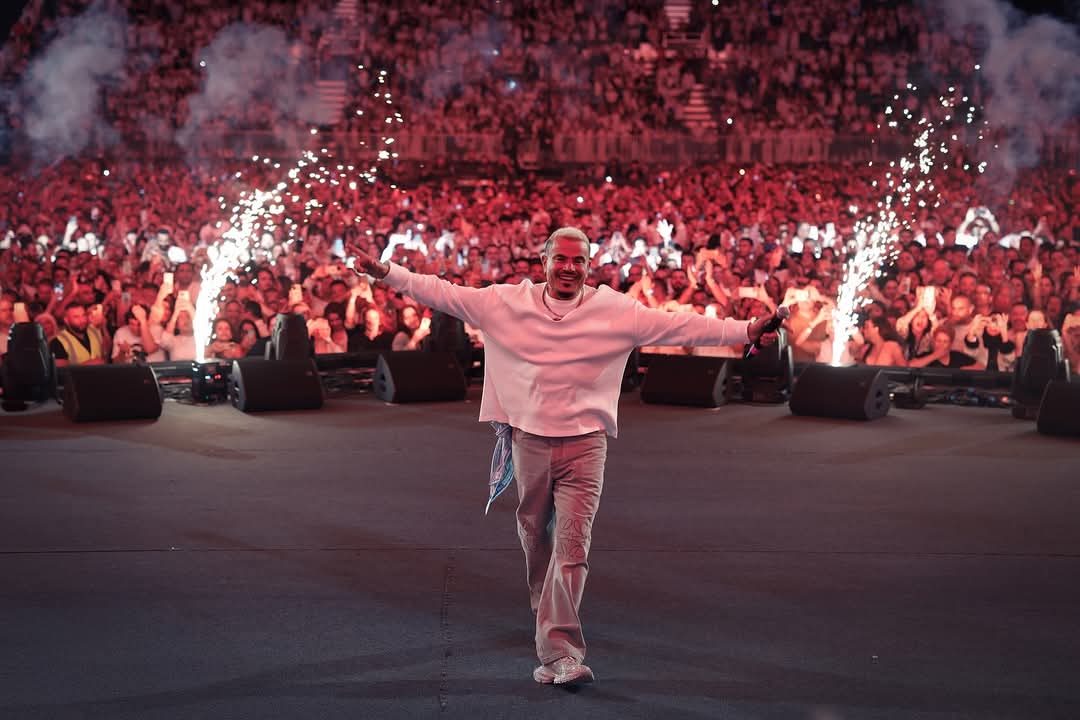 وختم الهضبة حفله بتحيه الجمهور وسط استعراضات من الألعاب النارية .