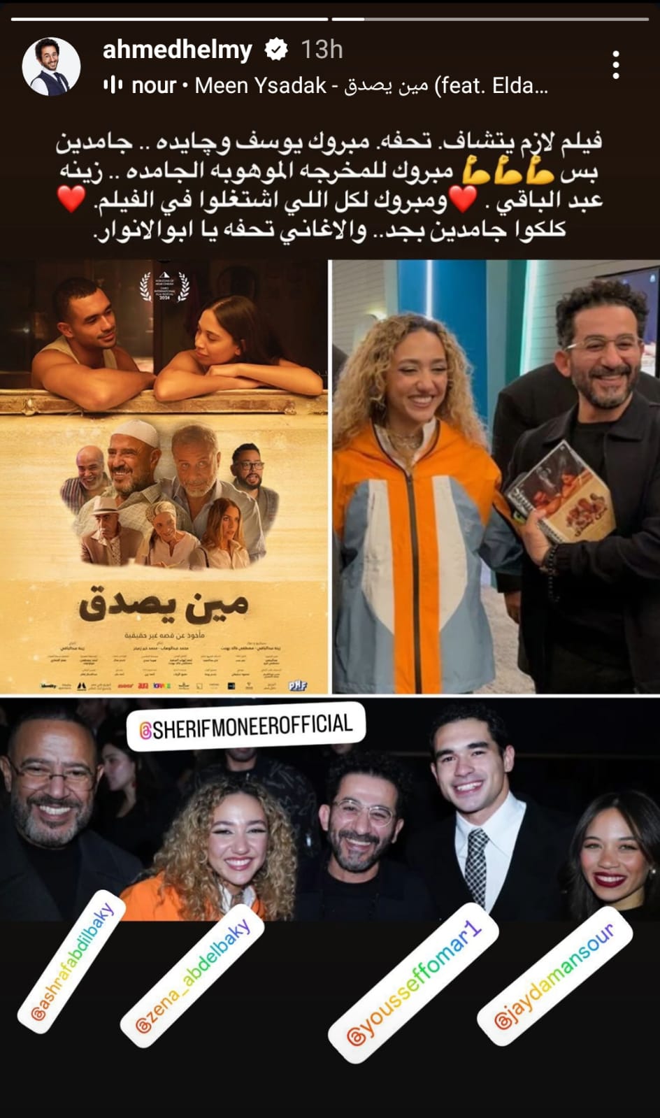 نشر أحمد حلمي ستوري على صفحته الرسمية عبر موقع تبادل الصور والفيديوهات "إنستجرام" وعلق قائلا : "فيلم لازم يتشاف، تحفة، مبروك يوسف وجايدة جامدين بس، مبروك للموهوبة الجامدة زينة عبد الباقي، ومبروك لكل اللي اشتغلوا في الفيلم، كلكم جامدين بجد، والأغاني تحفة يا أبو الأنوار" .