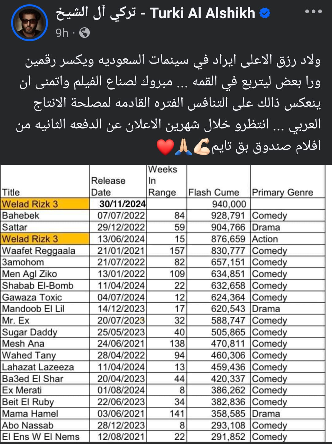 أعلن المستشار تركي آل الشيخ رئيس الهيئة العامة للترفيه عن تصدر فيلم ولاد رزق 3 قائمة شباك التذاكر السعودي حيث أصبح الأعلى إيراد بسينمات السعودية .
