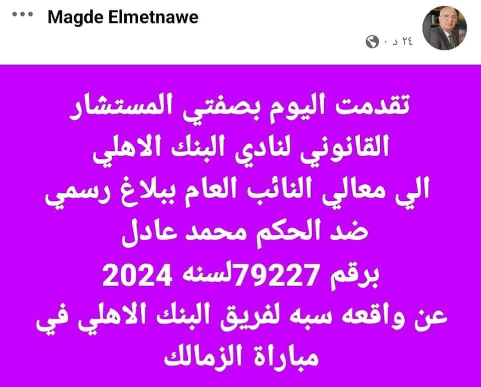 ونشر مجدي المتناوي المستشار القانوني لنادي البنك الأهلي عبر صفحته على فيس بوك : " تقدمت اليوم بصفتي المستشار القانوني لنادي البنك الأهلي إلي النائب العام ببلاغ رسمي ضد الحكم محمد عادل برقم 79227لسنه 2024 عن واقعه سبه لفريق البنك الأهلي في مباراة الزمالك".
