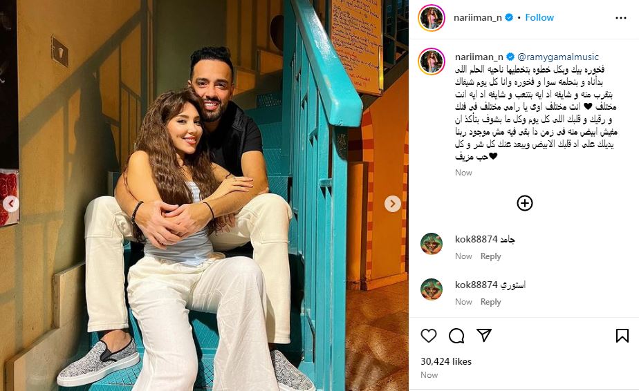 ونشرت ناريمان صور رومانسية برفقته وعلقت عليها "فخوره بيك وبكل خطوه بتخطيها ناحية الحلم اللى بدأناه و بنحلمه سوا و فخوره وانا كل يوم شيفاك بتقرب منه ".