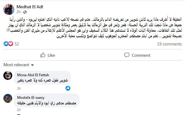 وكتب مدحت العدل عبر صفحته الرسمية "فيس بوك" " الحقيقة لا أعرف ماذا يريد كابتن شوبير من تعريضه الدائم بالزمالك.. حتى في نصحه اللاعب ناديه الذي اخذوه ليربوا والذين رأينا جميعا عن ماذا نتجت تلك التربية الحسنة- همز ولمز في حق الزمالك بما لا يليق بعمر ومكانة شوبير شخصيا لا الزمالك الذي لن يهتز لمثل تلك التفاهات".