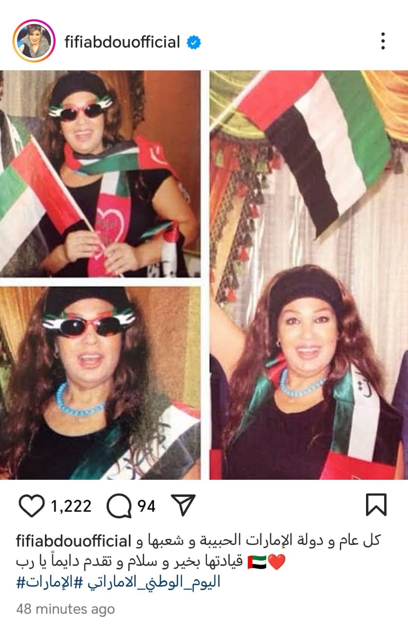 البداية مع الفنانة المصرية فيفي عبده الذي نشرت صوراً لها مع العلم الإماراتي احتفاء باليوم الوطني ونشرت عبر إنستجرام منشور كتبت فيه "كل عام ودولة الإمارات الحبيبة وشعبها، وقيادتها بخير وسلام وتقدم دائم.. اليوم الوطني الإماراتي"، فيما كتبت اللبنانية إليسا "كل سنة ودولة الإمارات بخير ورايتها مرفوعة، عيد وطني سعيد لدولة الاتحاد والنجاح".