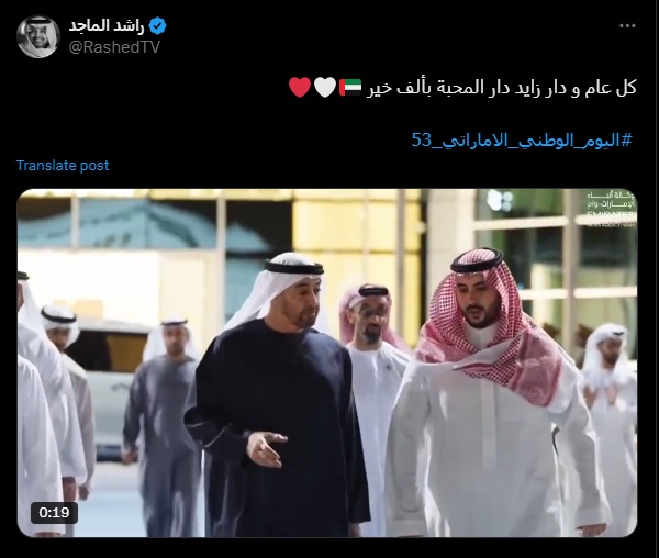 ونشر المطرب السعودي راشد الماجد مقطع فيديو مصحوباً بأغنية وطنية للإمارات، ظهر فيها رئيس دولة الإمارات الشيخ محمد بن زايد آل نهيان وكتب عبر تغريدة في حسابه الرسمي عبر منصة "X" قال فيها “كل عام ودار زايد دار المحبة بألف خير"، فيما كتبت اللبنانية مريام فارس تغريدة عبر منصة X كتبت فيها “ كل عام والإمارات العربية المتحدة مصدر إلها للتطور والنجاح والإزدهار بحكمة قادتها ووفاء شعبها.. يوم الإتحاد الإماراتي".