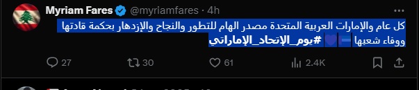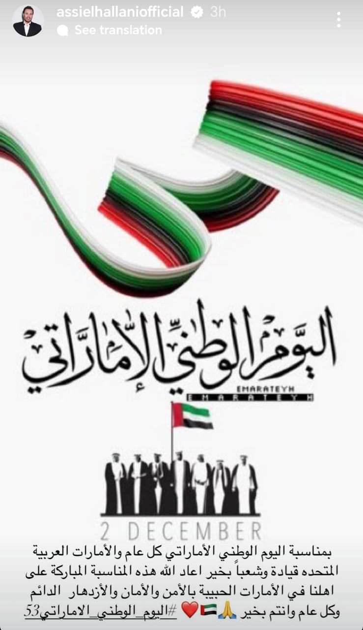ونشر المطرب اللبناني رامي عياش عبر حسابه الرسمي على منصة "X" صورة للعلم الإماراتي معلقاً عليه "أمنٌ وسلامٌ لدولةٍ يليق بها النجاح وأرضٍ تنبض بالحياة... اليوم الوطني الإماراتي"، وكتبت اللبنانية نانسي عجرم تغريدة عبر حسابها الرسمي على منصة "X" أيضاَ قالت فيها "اتحاد قوته تزداد.... كل عام ودولة الإمارات رائدة بأبنائها وإنجازاتها".