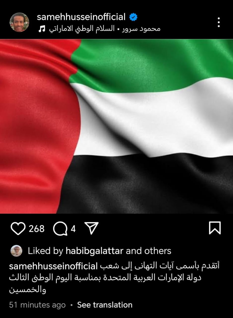 ونشر المطرب اللبناني راغب علامة المقيم بدولة الإمارات منذ سنوات مقطع فيديو له من برنامج إكس فاكتور لأغنية "يا إمارات المحبة"، وهنأ دولة الإمارات شعباً وقيادة باليوم الوطني الإماراتي معلقاً "كل عام وبلدي الثاني الإمارات بخير.. بلد الأمن والأمان.. الله يديمها عليكم".
