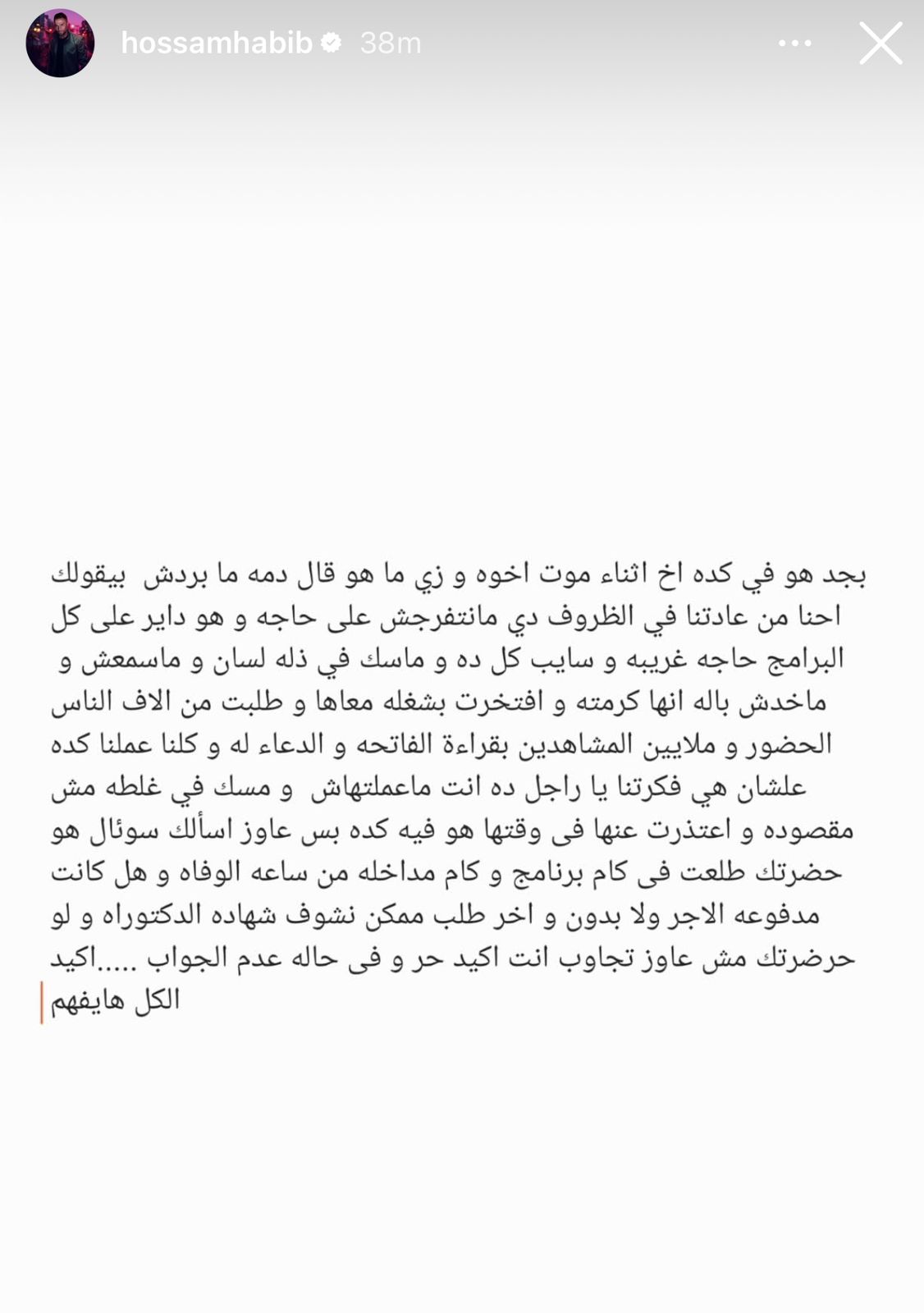 نشر حسام حبيب ستوري على صفحته الرسمية عبر موقع تبادل الصور والفيديوهات "إنستجرام" وعلق قائلا : "بجد هو في كده اخ اثناء موت اخوه و زي ما هو قال دمه ما بردش بيقولك احنا من عادتنا في الظروف دي مانتفرجش على حاجه و هو داير على كل البرامج حاجه غریبه و سایب كل ده و ماسك في ذله لسان و ماسمعش و ماخدش باله انها كرمته و افتخرت بشغله معاها و طلبت من الاف الناس الحضور و ملايين المشاهدين بقراءة الفاتحه و الدعاء له و كلنا عملنا كده علشان هي فكرتنا يا راجل ده انت ما عملتهاش و مسك في غلطه مش مقصوده و اعتذرت عنها في وقتها هو فيه كده بس عاوز اسألك سوئال هو حضرتك طلعت في كام برنامج و كام مداخله من ساعه الوفاه و هل كانت مدفوعة الاجر ولا بدون و اخر طلب ممكن نشوف شهاده الدكتوراه و لو حرضرتك مش عاوز تجاوب انت اكيد حر و فى حاله عدم الجواب ..... أكيد الكل هايفهم" .