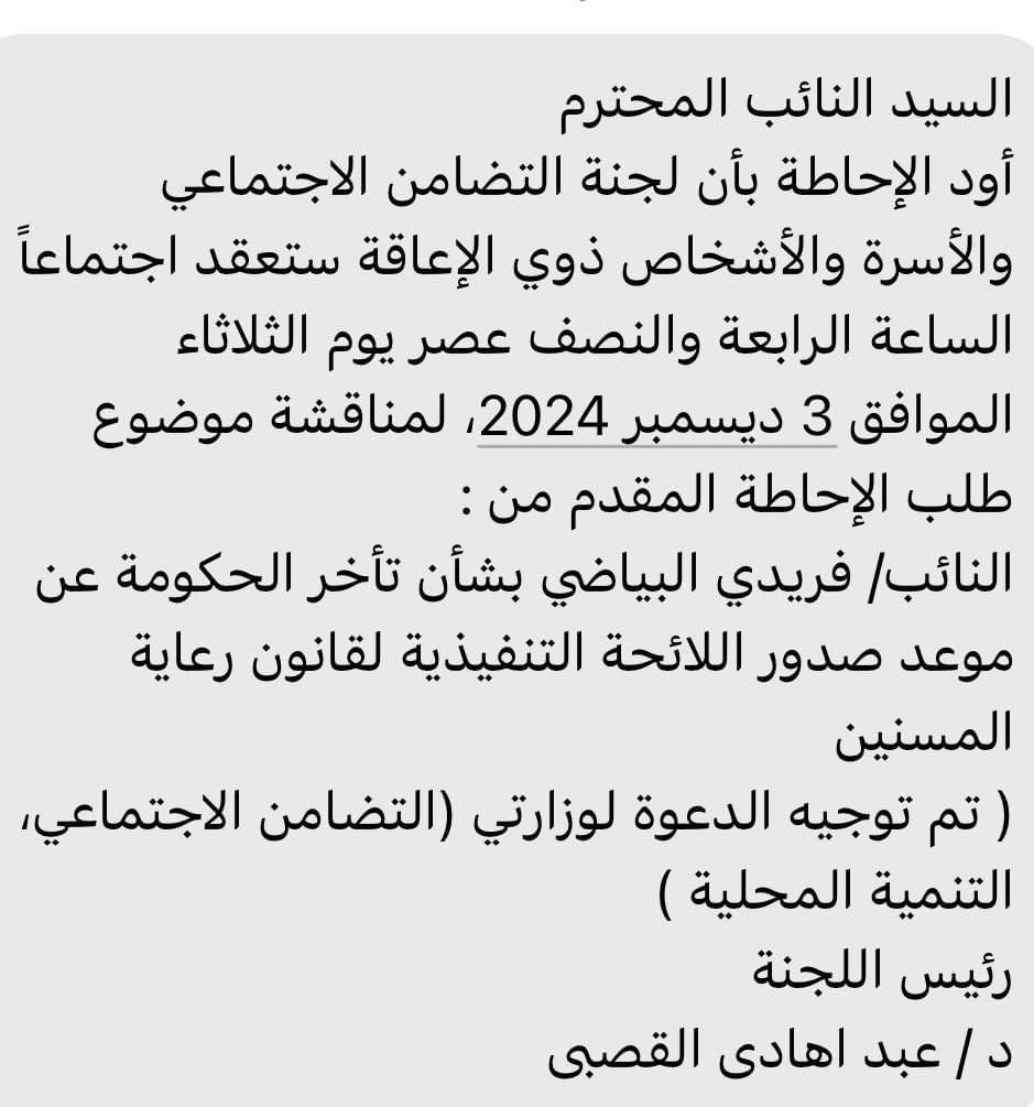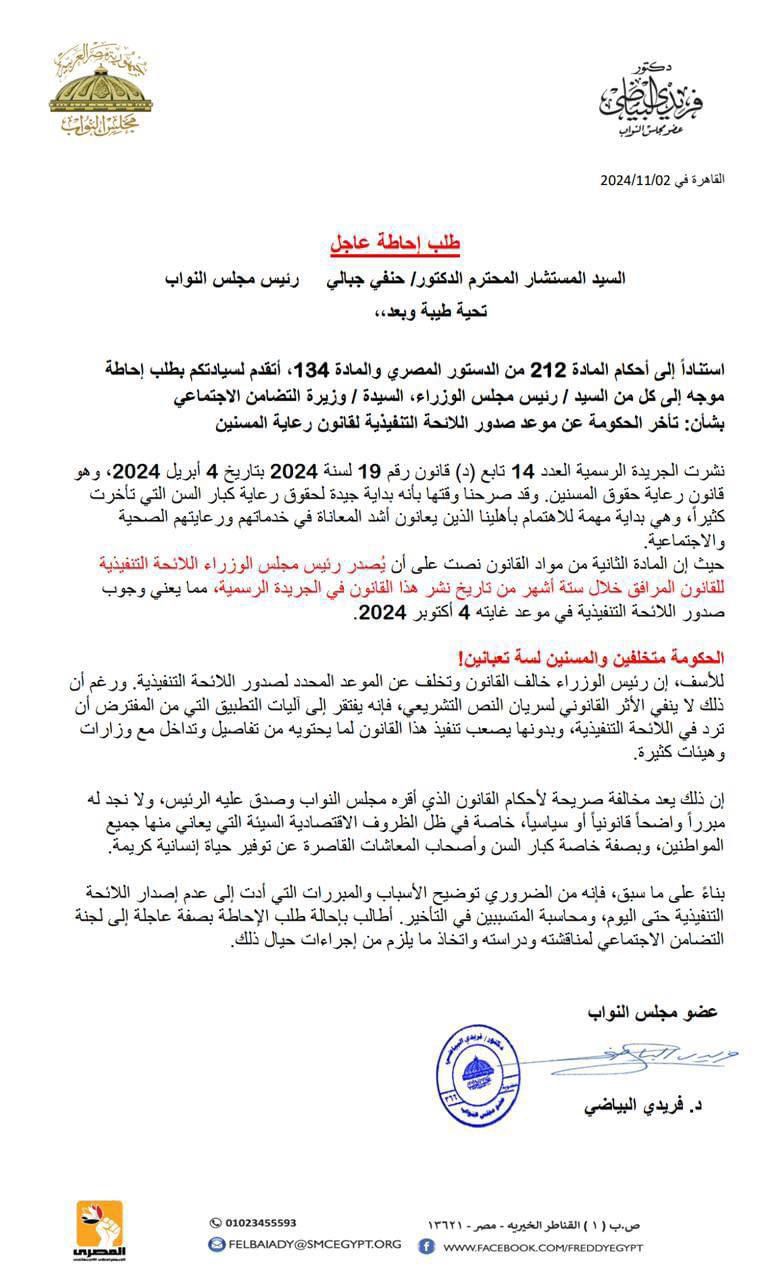 وجّه البياضي طلب الإحاطة إلى رئيس مجلس الوزراء ووزيرتي التضامن الاجتماعي والتنمية المحلية، وذلك بسبب التأخر في إصدار اللائحة التنفيذية لقانون رعاية المسنين، مشددًا على ضرورة الإسراع بتنفيذ القانون لضمان حقوق المسنين وتحسين جودة الخدمات المقدمة لهم.