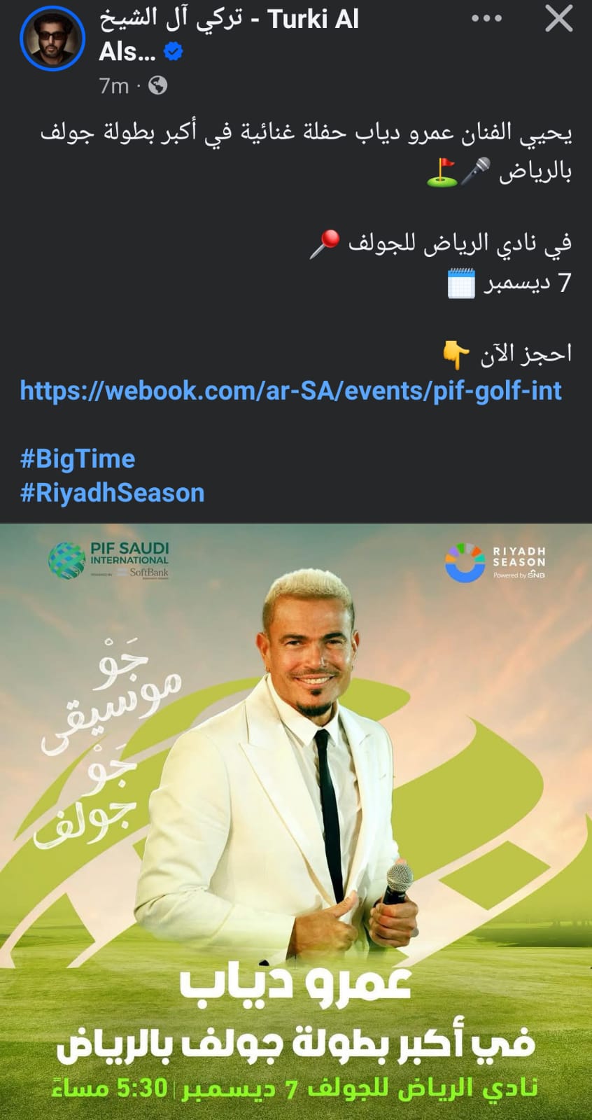 نشر المستشار تركي آل الشيخ صورة بوستر الحفل على صفحته الرسمية عبر موقع التواصل الاجتماعي "فيسبوك" وعلق قائلا:"يحيي الفنان عمرو دياب حفلة غنائي في أكبر بطولة جولف بالرياض، في نادي الرياض للجولف 7 ديسمبر".